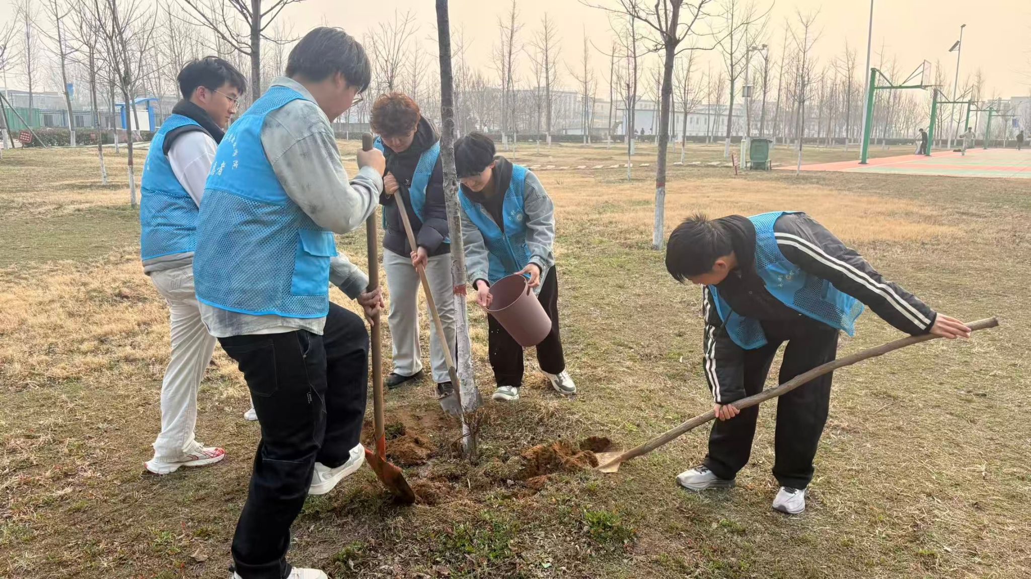 活动现场,志愿者们热情高涨、干劲十足,充分发扬团结协作、吃苦耐劳的优良作风。大家分工明确、配合默契,挥锹挖坑、扶正树苗、填土夯实、提水浇灌,每一道工序都认真细致、有条不紊。经过一番辛勤劳作,一棵棵新苗迎着春风稳稳扎根,为校园生态环境播撒下绿色的希望。大家忙碌穿梭的身影、彼此协助的画面,交织成一幅充满青春气息的劳动画卷,为春日校园增添了一道温暖而有力量的风景线。
