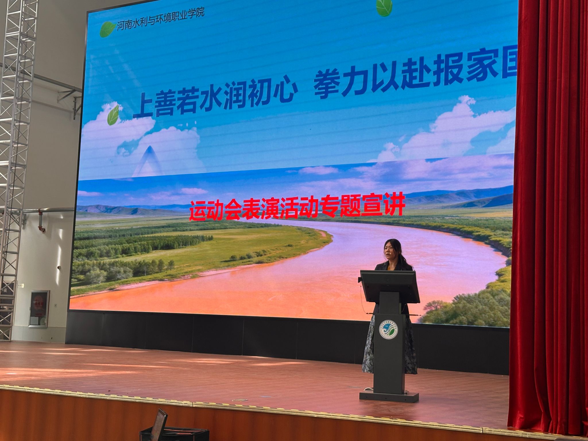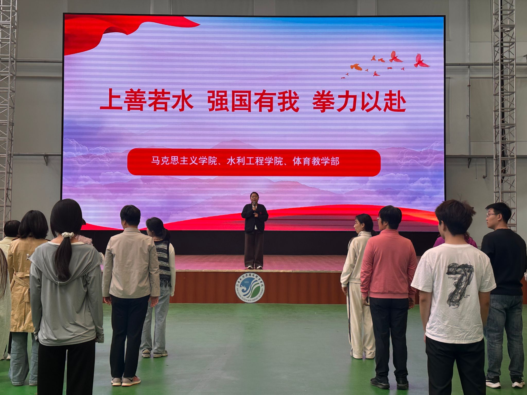 2026年4月14日,由水利工程学院、马克思主义学院联合主办的“上善若水润初心 拳力以赴报家国”运动会表演训练宣讲会在航空港校区敏行楼举行。活动将千年水文化、黄河报国志、体育强国梦与青年使命担当深度融合,吹响了水利青年学子以本次运动会表演训练为契机、赛场报国的集结号。