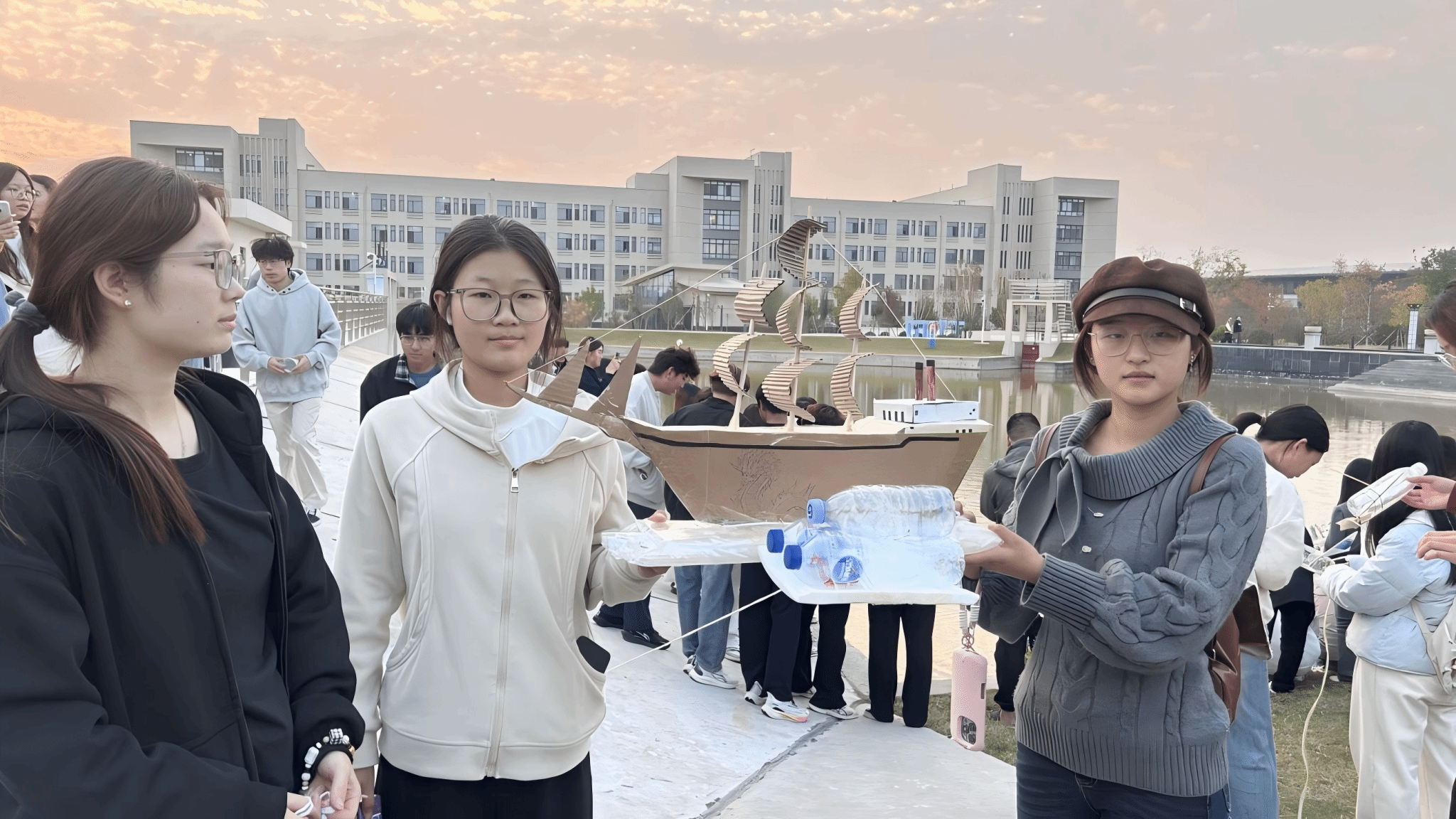 活动围绕“资源再利用”“结构设计”与“水体保护”等主题,明确将环保理念、专业知识和团队协作融入活动各环节。制定了详细的活动方案,鼓励学生以团队形式参与。利用废弃材料完成从设计到制作的全过程,实现“学中做、做中创。在制作环节中,同学们三人一组,充分利用塑料瓶、旧纸箱、泡沫板、易拉罐等常见废弃材料,结合流体力学、材料力学与结构稳定性等课堂知识,亲手设计并制作可在水面稳定漂浮的小船。在志愿者的引导下,各小组于指定安全水域进行了小船下水测试。同学们通过绳索操控小船行进,一艘艘形态各异、创意十足的环保小船水面上平稳前行,在水面平稳前行。现场气氛热烈,掌声与欢呼不断,青春的巧思与环保的热情交相辉映。经过综合评选,活动最终决出一等奖1名、二等奖2名、三等奖3名。