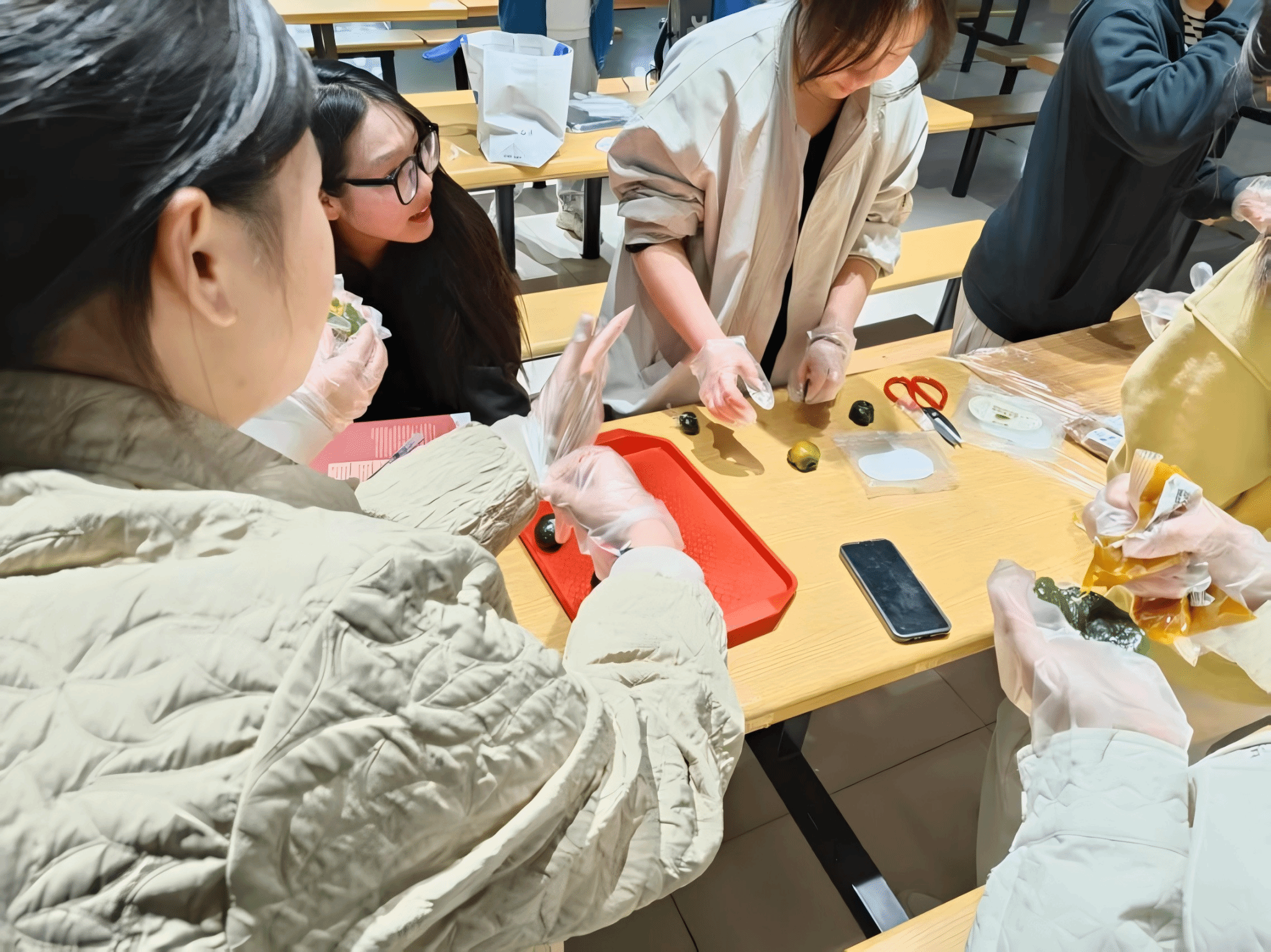 为了确保活动顺利进行志愿者提将青团皮、各种馅料、工具准备妥当,活动当天志愿者向参与同学讲解了清明节的传统文化内涵、青团的象征意义及青团的制作方法及技巧。讲解完毕,同学们分组动手实践,将不同的馅料裹进散发着艾草的清香的青团皮,制作出一个个碧绿软糯的青团。活动现场欢声笑语,大家互相交流心得,体验传统美食的制作乐趣。